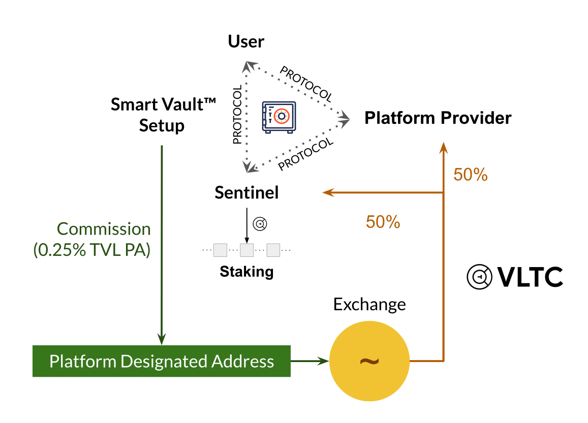 A small percentage fee is deducted from assets protected by Hybrid Custodyβ’ Vaults during setup and the respective coins are pooled and swapped for VaultCoin in open markets asynchronously. The VaultCoin thus earned is then distributed among the stakeholders ensuring long term sustainability of the ecosystem.